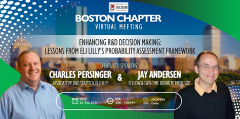 Join the SDP Boston Chapter for an engaging online discussion featuring Charles Persinger and Jay Andersen, who will share key insights from their extensive work in decision sciences and portfolio management at Eli Lilly. Discover how quantitative probability assessments have shaped 26 years of portfolio decisions, improving technical feasibility evaluations and investment strategies in pharmaceutical R&D.