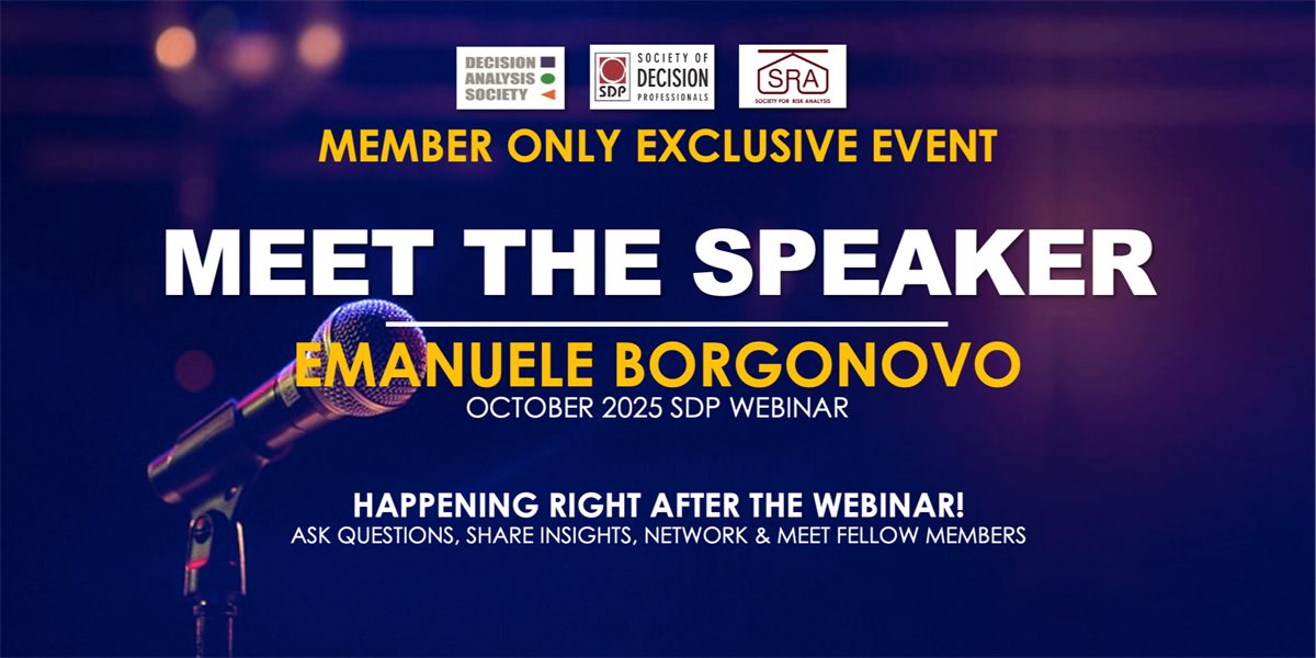 Right after the webinar, we will have a Meet the Speaker Session exclusively for Members of the Society of Decision Professionals (SDP), Decision Analysis Society (DAS) and Society for Risk Analysis (SRA).